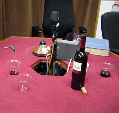 Нас проводили в место, где расположена самая большая в Бушхаузе радиостудия (обычно «Севаобороты», как нам рассказали, проходят в довольно маленькой комнатке). Увы, у нас уже не было времени на то, чтобы посмотреть столовую, в которой за час до эфира начинается предварительная беседа ведущих с гостем «Севаоборота». Зато традиционное вино и стаканчики были приготовлены на всех. Мы расселись на стульях в студии. В очередной раз нам строго напомнили: снимать категорически запрещено.